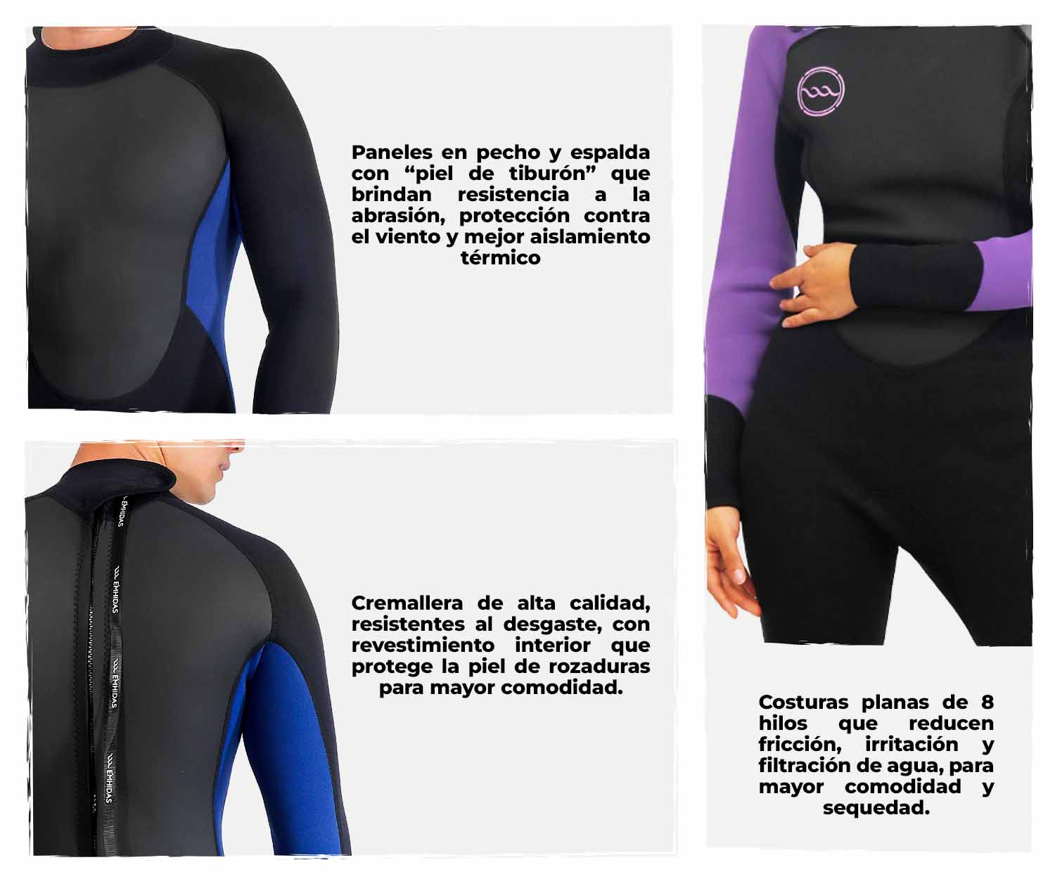 • Paneles de piel de tiburón en pecho y espalda.