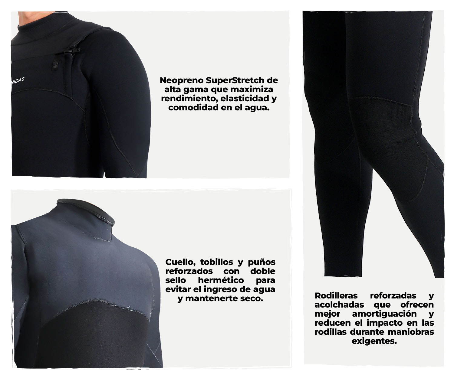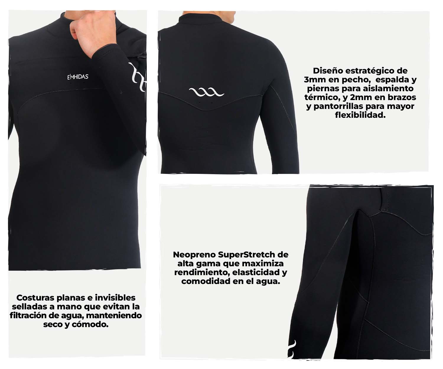 - Neopreno SuperStretch de 3/2 mm (3 mm en el torso, 2 mm en brazos y piernas).