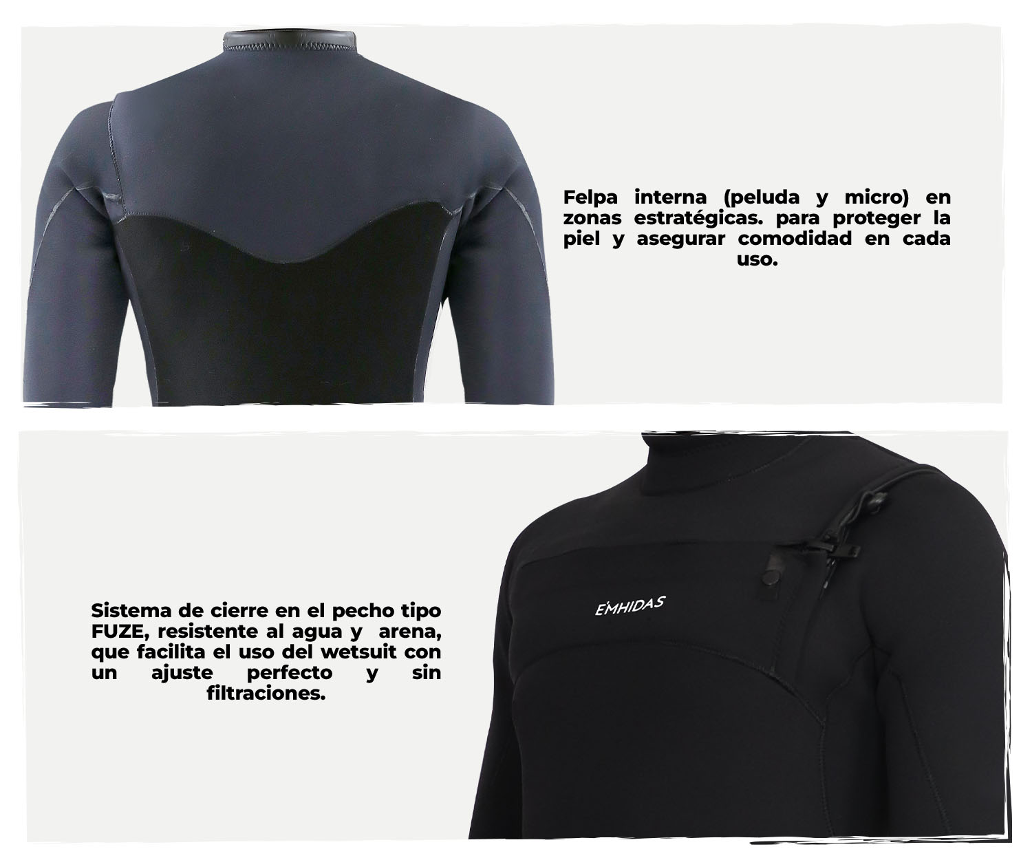 - Cremallera de pecho tipo FUZE resistentes al agua y salinidad.