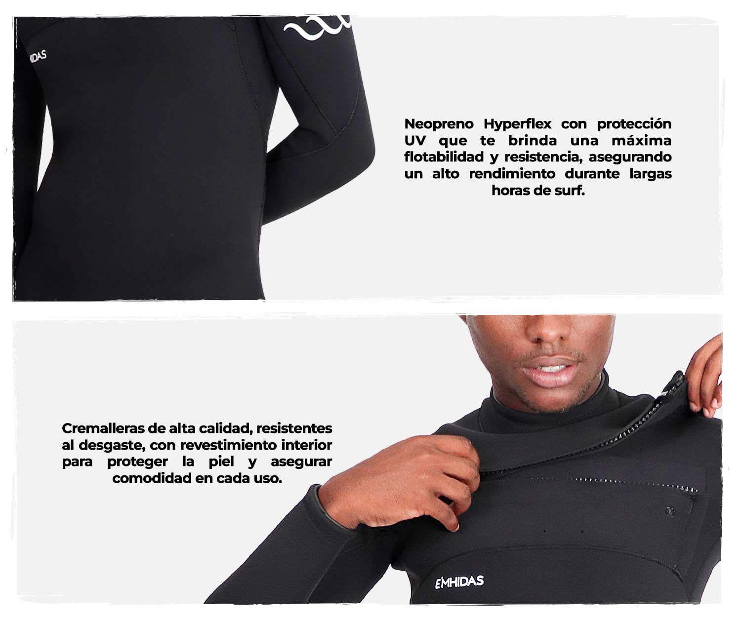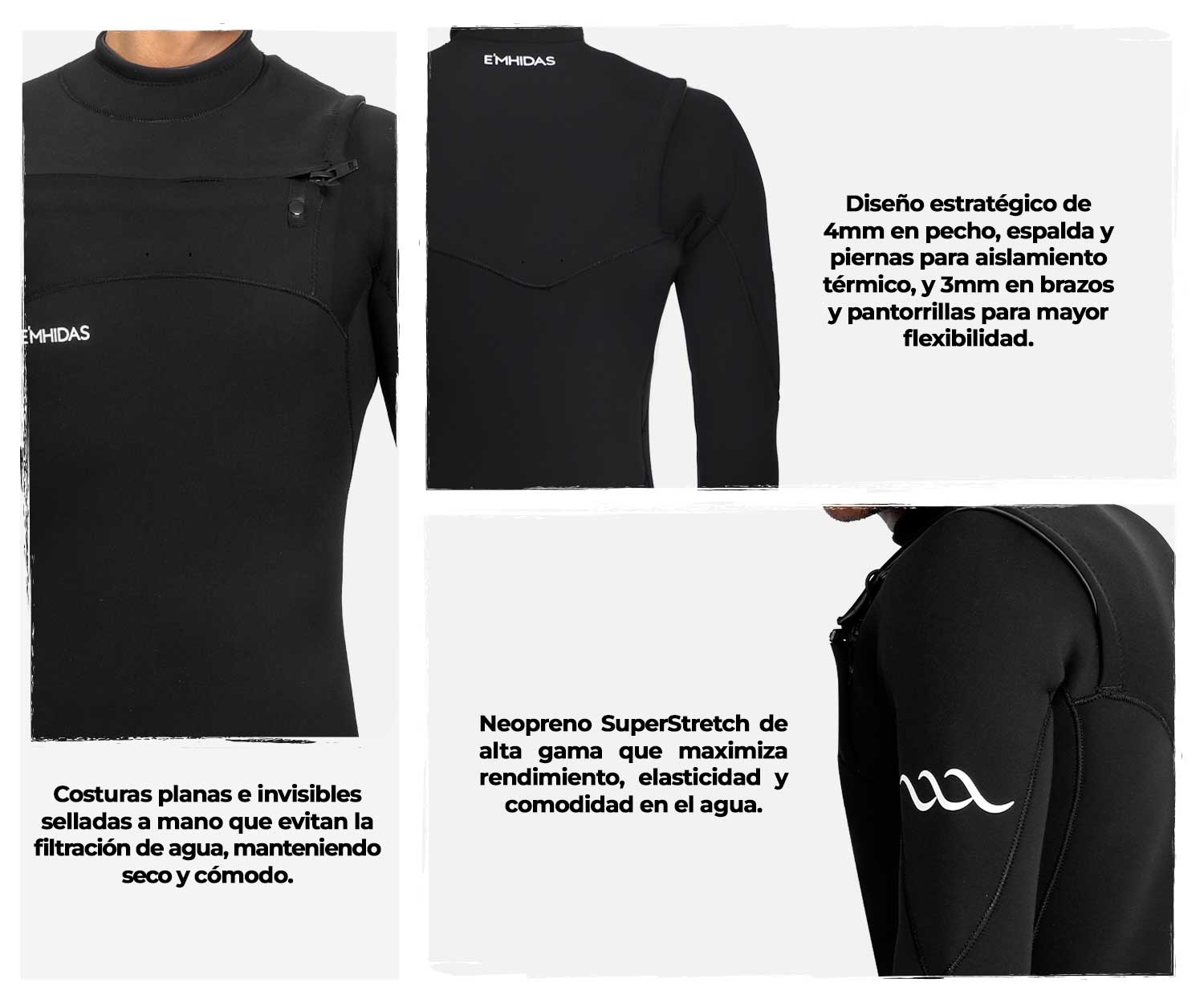 • Hecho a base de neopreno de alta calidad con tecnología SuperStretch de 4/3mm. (4 mm en el cuerpo, 3 mm en brazos/piernas)