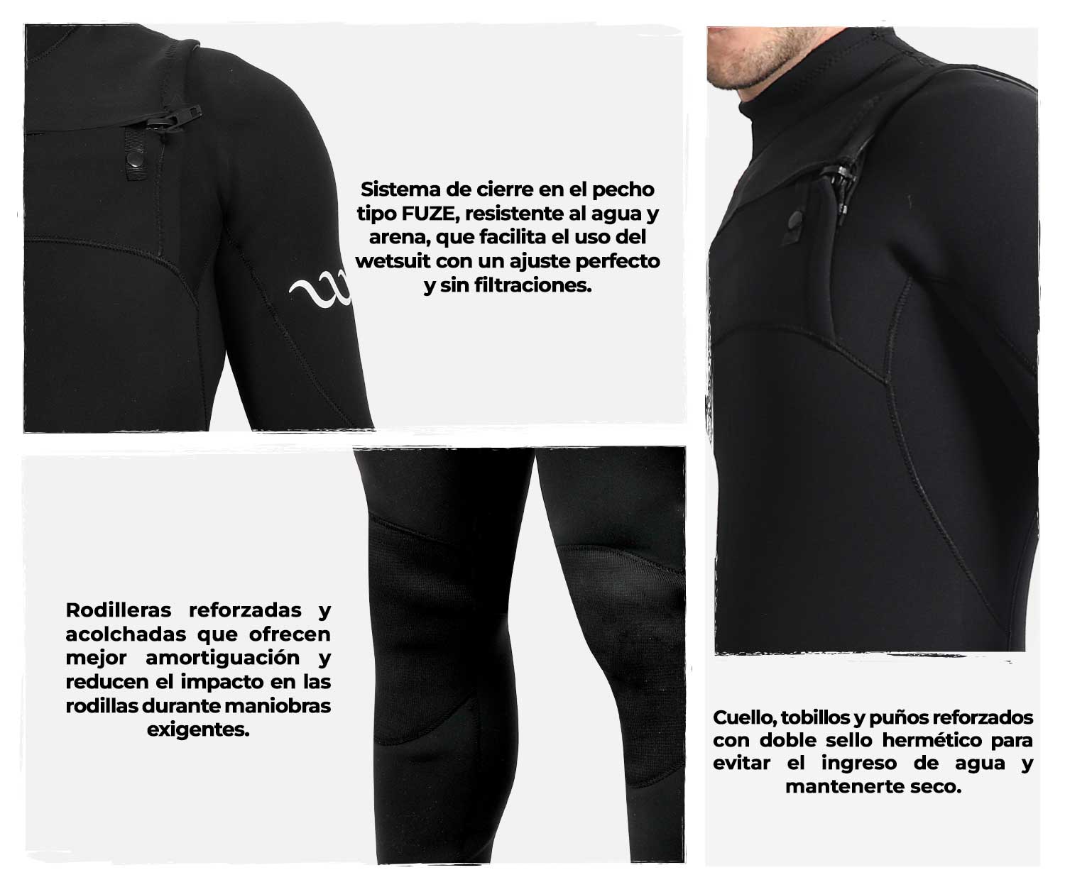 El diseño incluye un cierre delantero altamente flexible, que facilita el uso y evita filtraciones de agua. La construcción de costuras planas y selladas a mano minimizan la entrada de agua y asegura que tu cuerpo se mantenga cálido incluso en las condiciones más exigentes. Este wetsuit no solo ofrece la máxima calidad y rendimiento, sino que también incorpora características de alta gama para una protección y confort excepcionales en todas tus aventuras acuáticas, siendo ideal para surfistas, nadadores y practicantes de deportes acuáticos como bodyboard y stand up paddle.